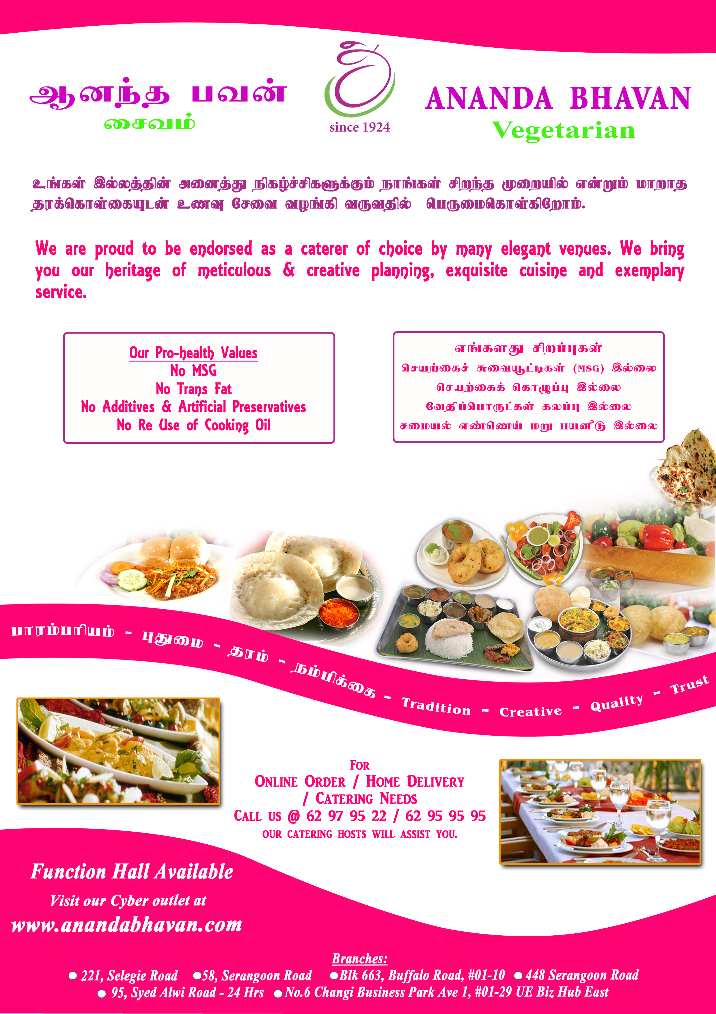 Ananda Bhavan restaurant now serves a splendid selection of North Indian, South Indian, and Indian Chinese cuisines. Besides well-known for providing high quality authentic Indian food, Ananda Bhavan has also its customers’ wellness in mind: No added MSG, No artificial Preservatives, No Additives and No Re-use of Cooking Oil is used when preparing the food.